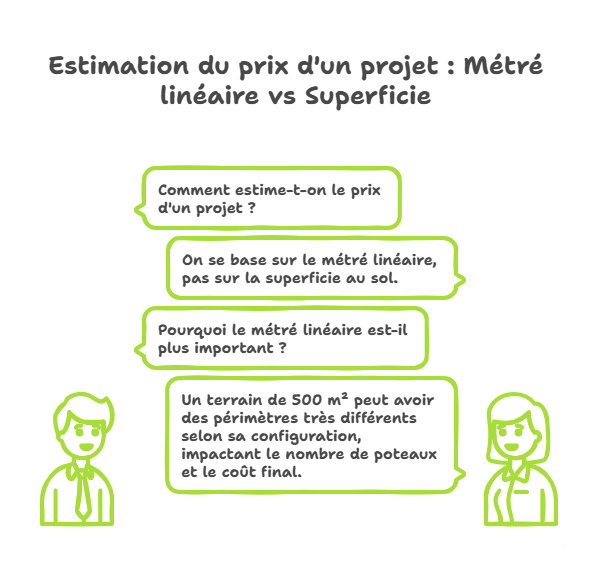 Pour estimer le prix de votre projet, on ne se base pas sur la superficie au sol, mais sur le métré linéaire. Un terrain de 500 m² peut avoir des périmètres très différents selon sa configuration :